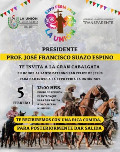 La Unión, Guerrero. – 14 de enero de 2026.- Se acerca la gran feria tradicional 2026 de La Unión, Guerrero en honor al santo patrono, San Felipe de Jesús donde el gobierno que preside el profesor Francisco Suazo Espino, encabezará a partir del 5 de febrero con la cabalgata tradicional en El Entronque de La Unión, previo se compartirá una comida con los participantes para iniciar el recorrido por casi 5 kilómetros hasta llegar al acceso de la cabecera municipal, donde recorrerán las calles del pueblo junto al contingente de carros alegóricos para dar inicio de esta gran fiesta con el corte del listón.